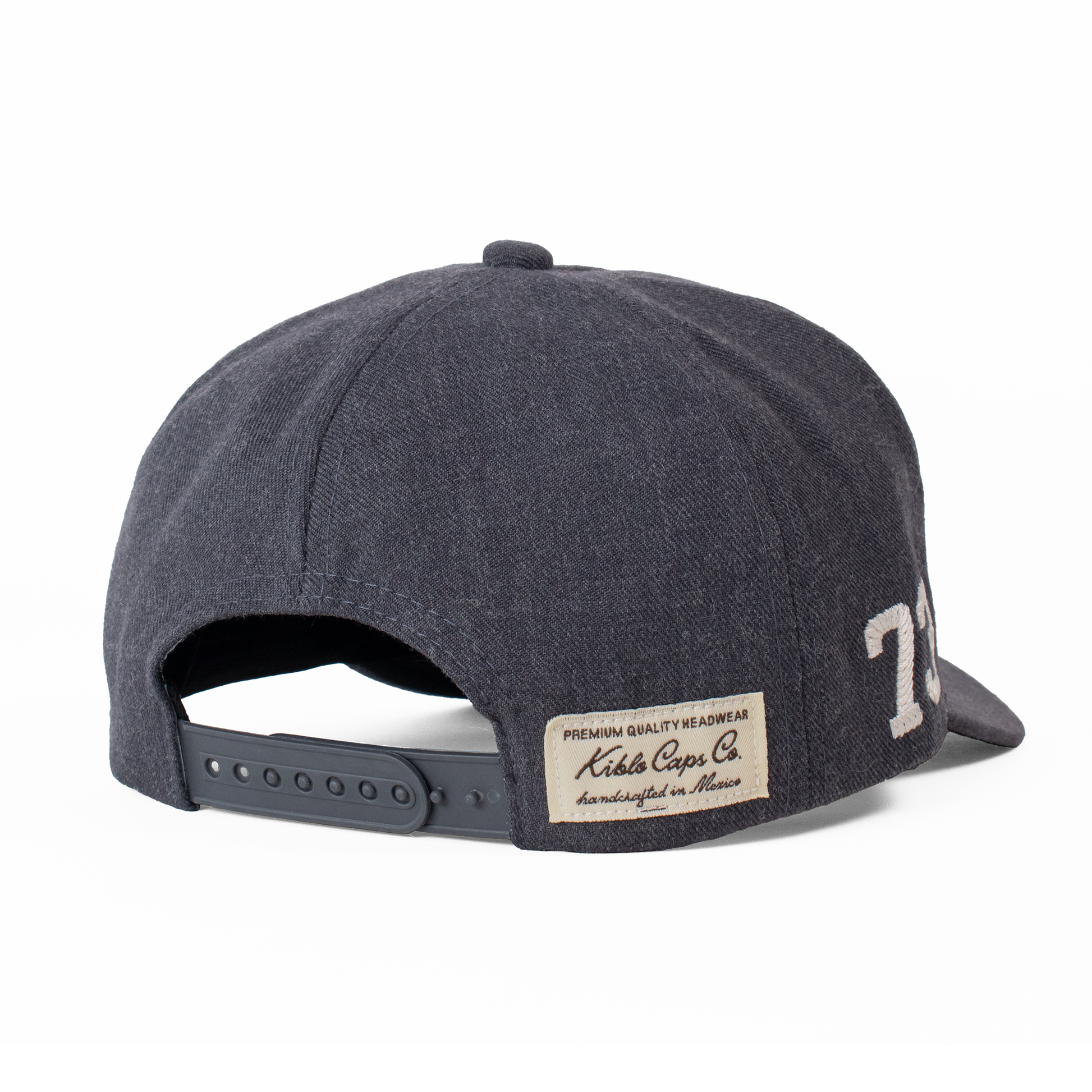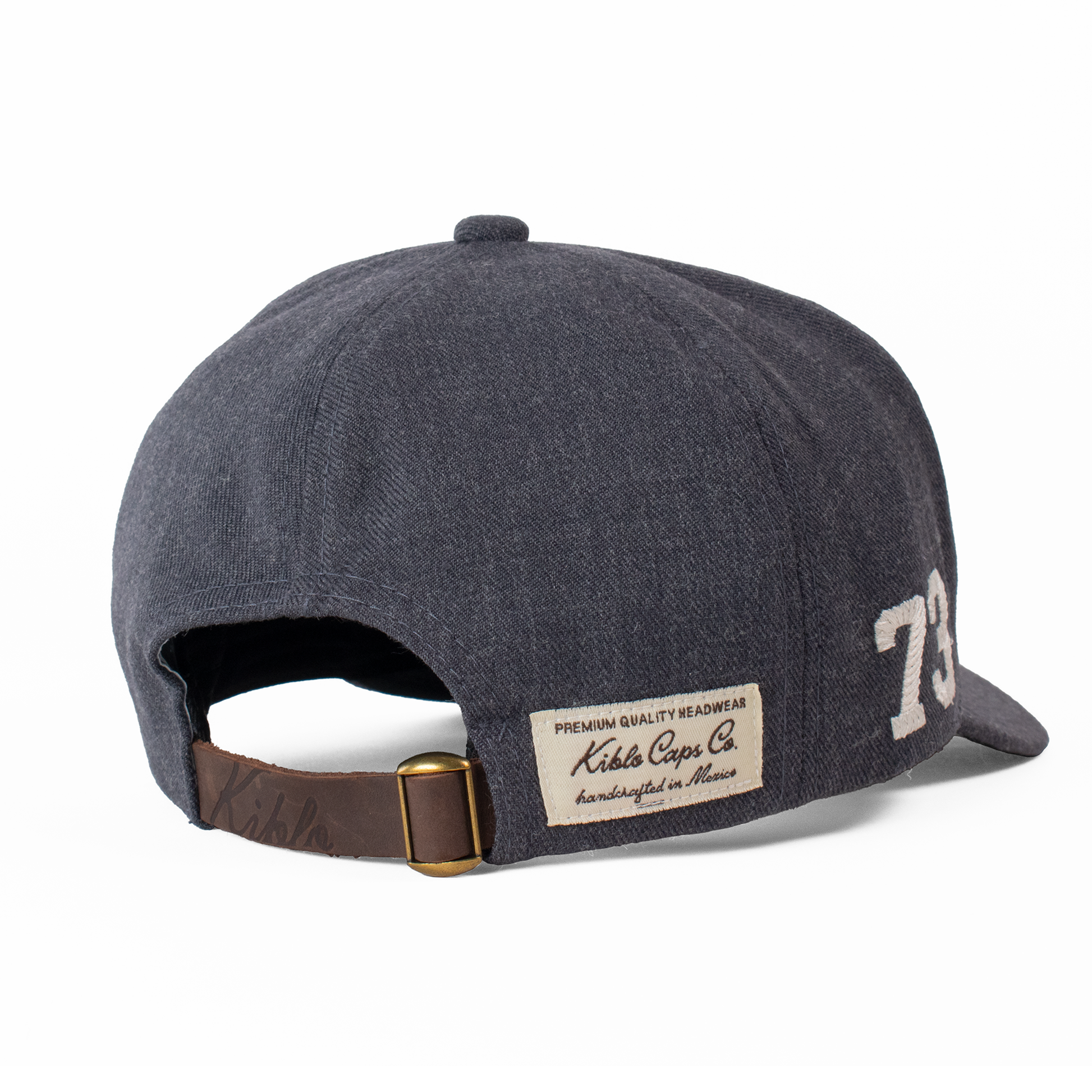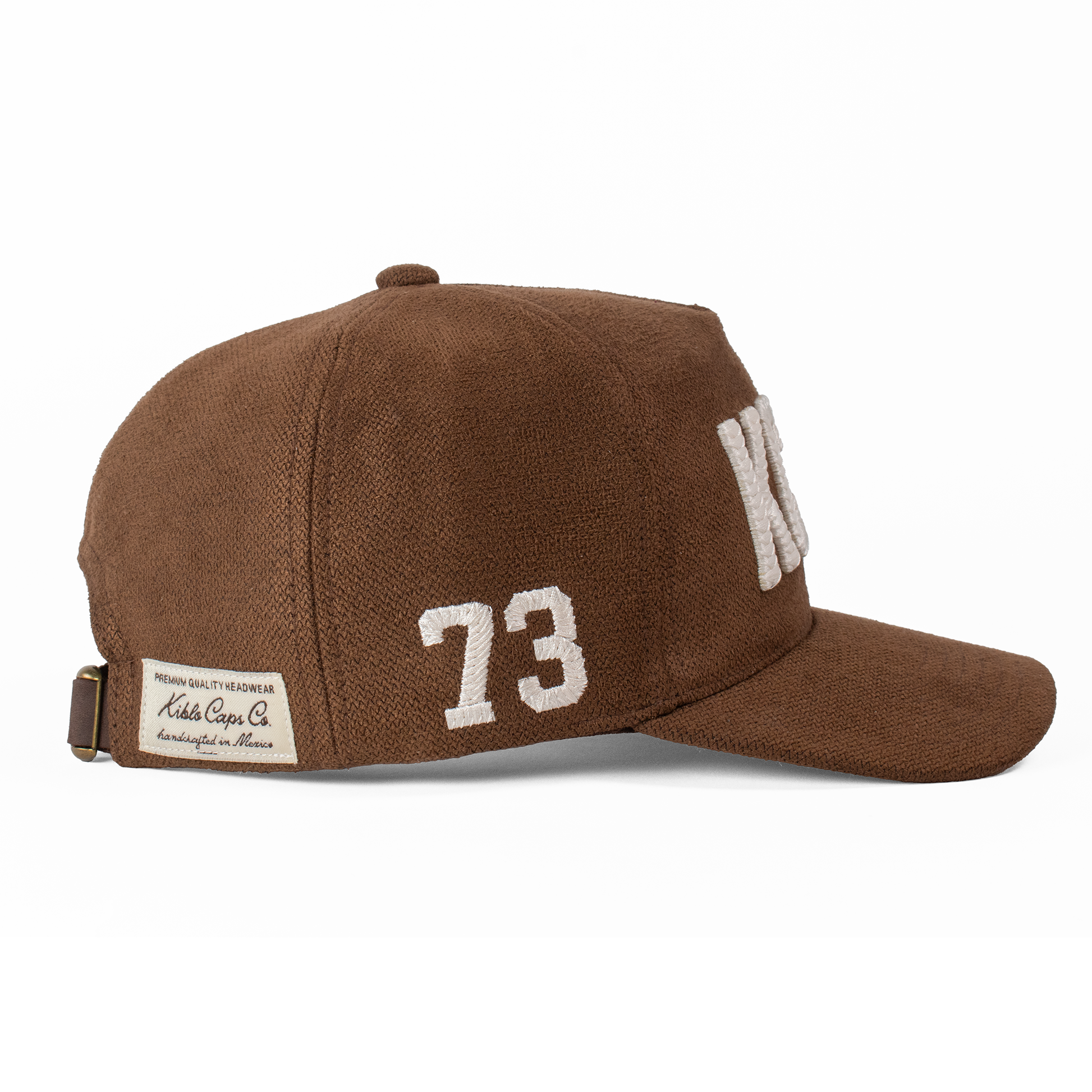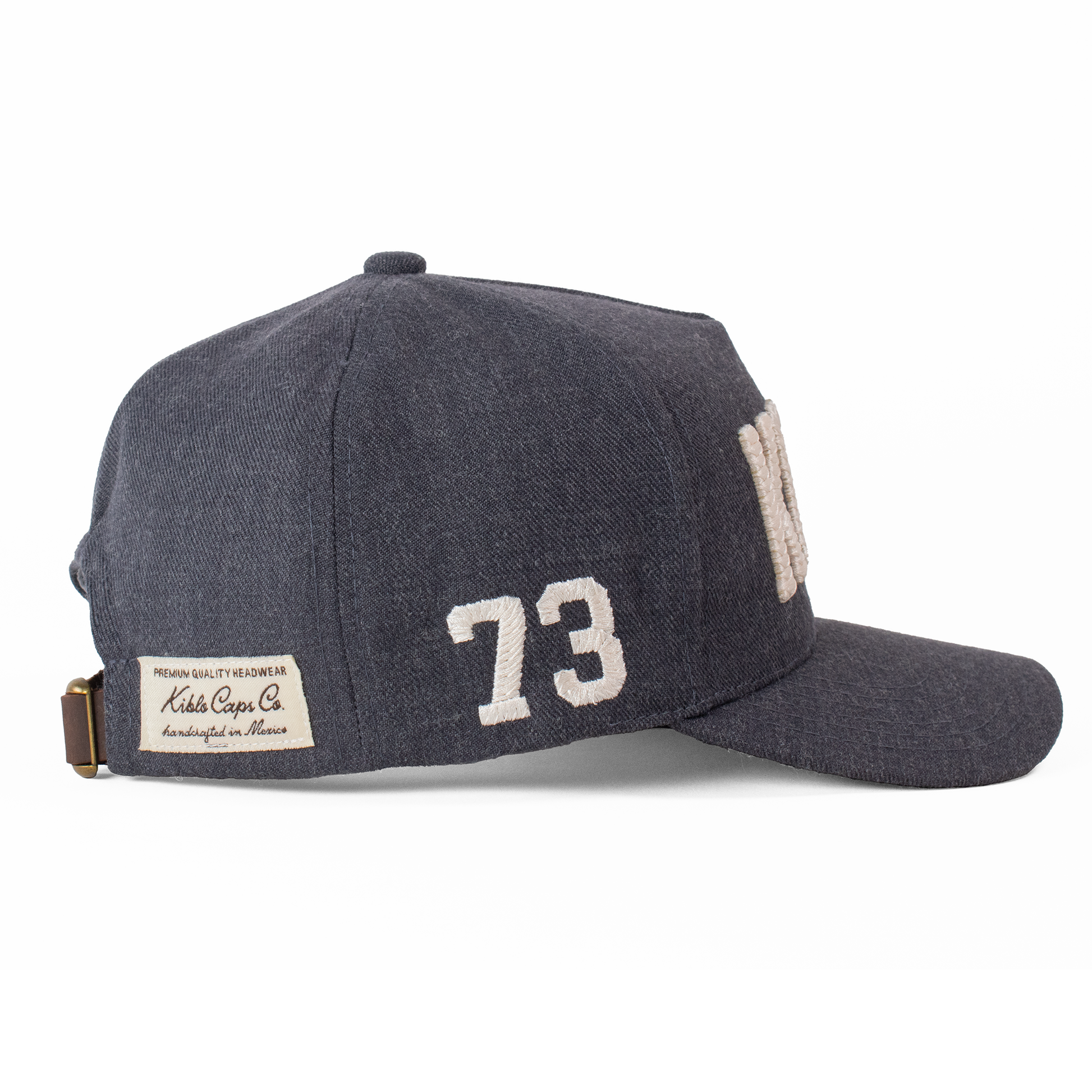 Acabados: Bordado frontal KCCO y lateral '73' con técnica calada que genera un relieve. Incluye la firma bordada Fourth Act en la parte posterior, pin metálico Kiblo en oro viejo, y etiqueta tejida "Kiblo Caps Co., handcrafted in Mexico".