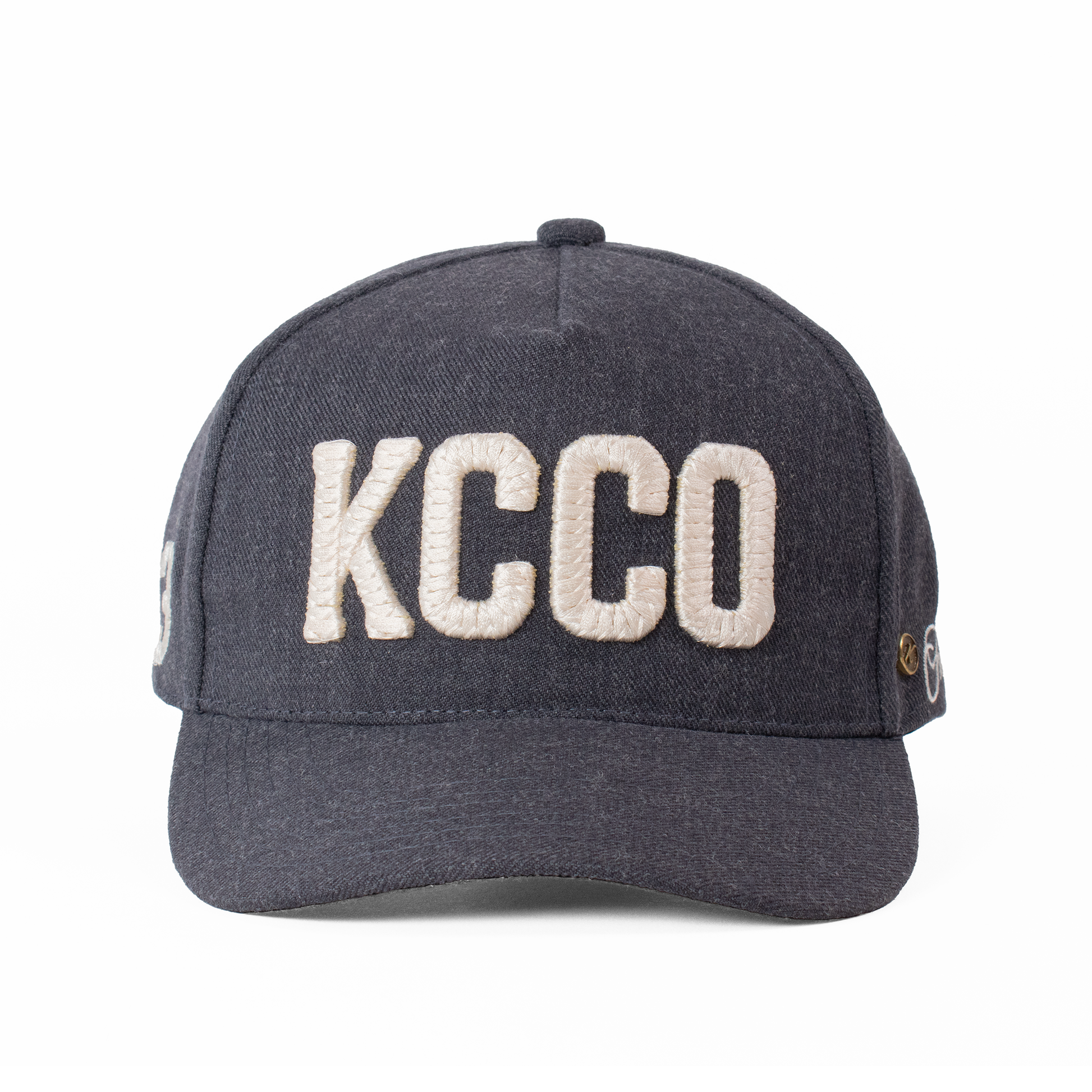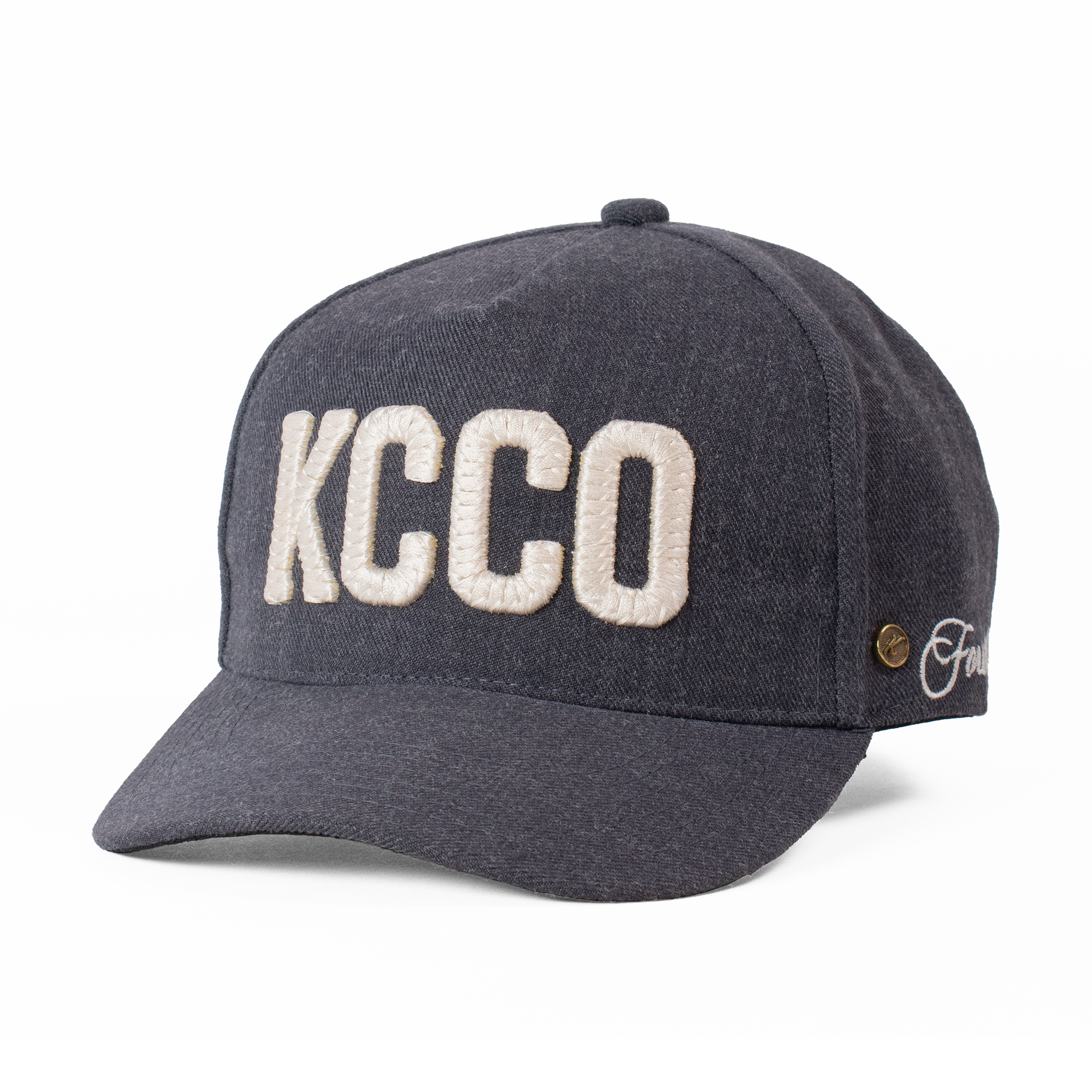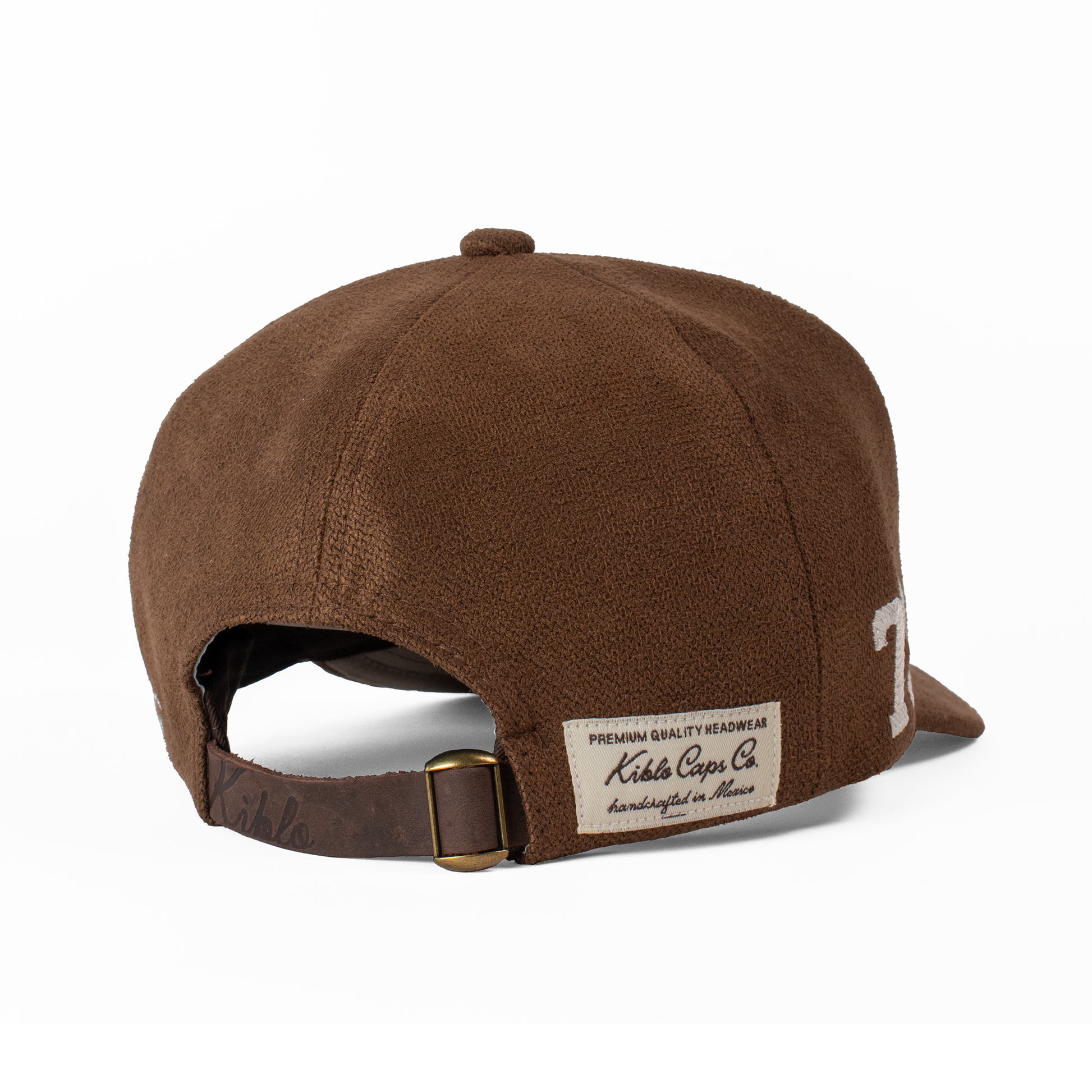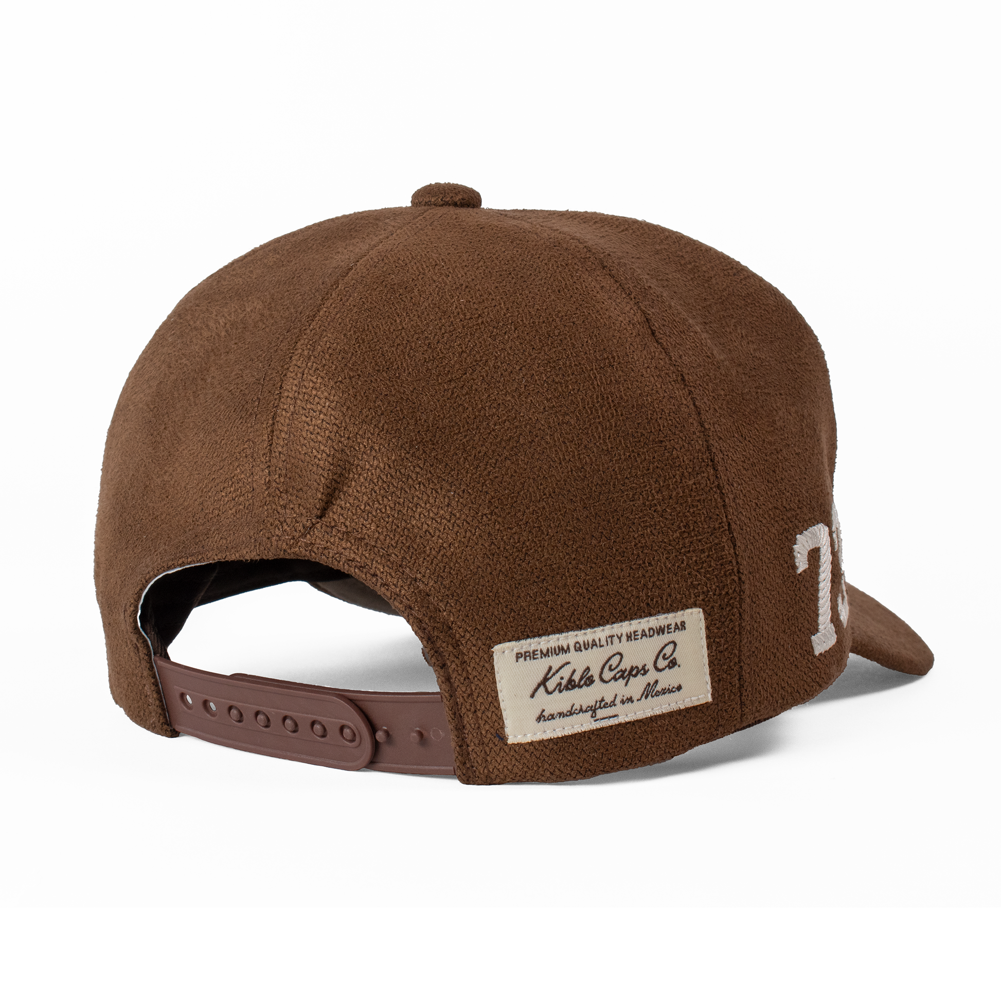 Acabados: Bordado frontal KCCO y lateral '73' con técnica calada que genera un relieve. Incluye la firma bordada Fourth Act en la parte posterior, pin metálico Kiblo en oro viejo, y etiqueta tejida "Kiblo Caps Co., handcrafted in Mexico".