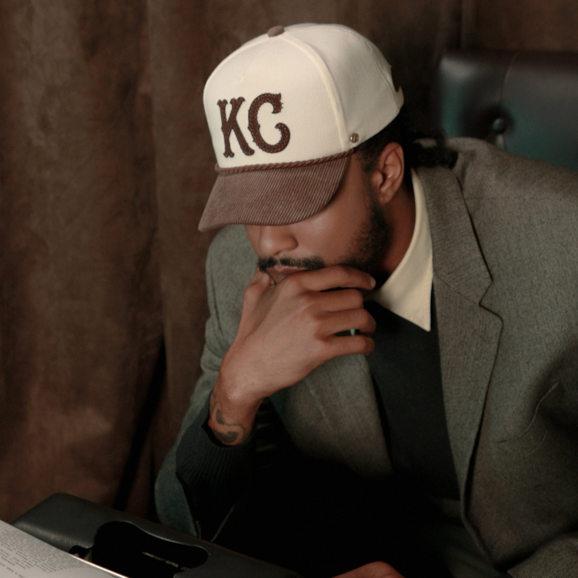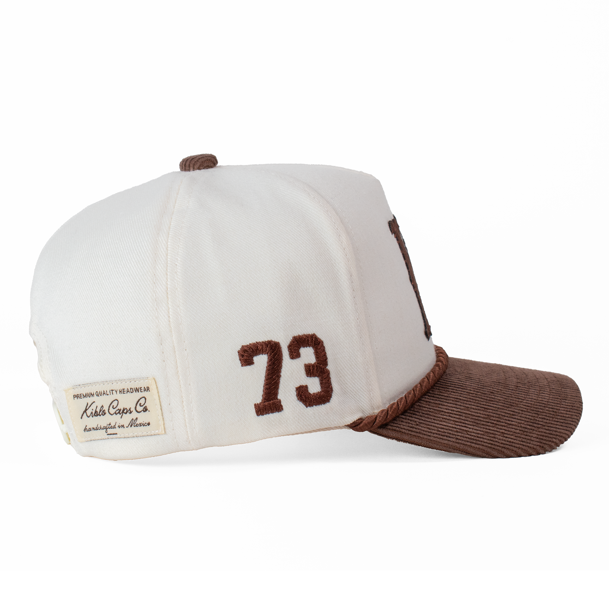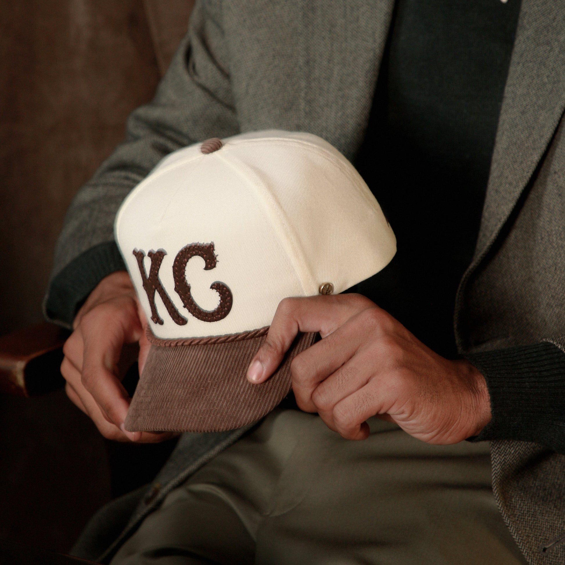 Acabados: Letras frontales 'KC' en parche de paño bordado con puntadas separadas y el número '73' con técnica de bordado calado. Pin metálico Kiblo en tono oro viejo, y etiqueta tejida posterior "Kiblo Caps Co., handcrafted in Mexico".
